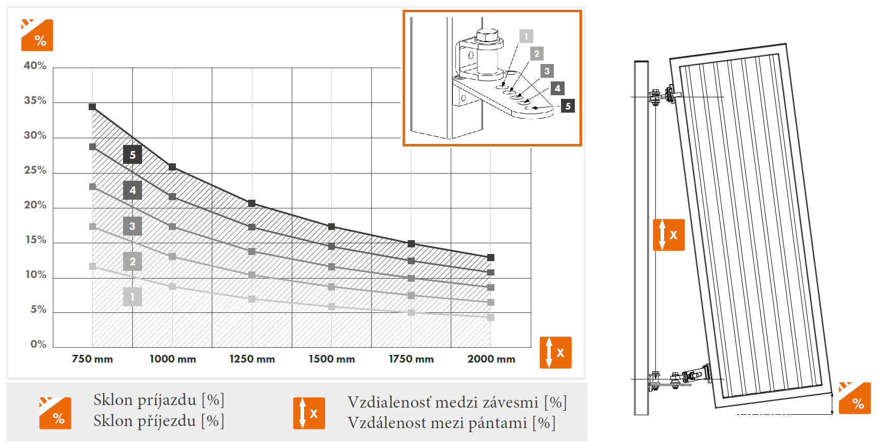- Nastavitelné pro sklon od 2 do 35 % (v závislosti na vzdálenosti mezi panty)