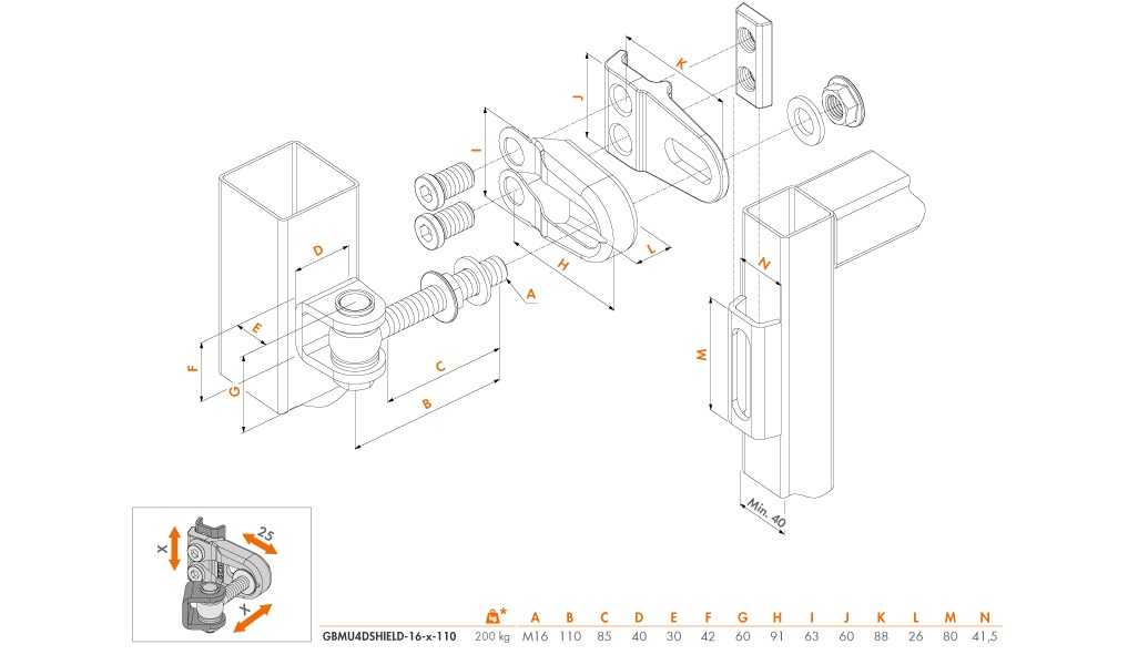 LOCINOX® GBMU4DSHIELD navařovací pant M16, otevíratelný 180°, nastavitelný 3D, zvýšená bezpečnost, částečně pozinkovaný