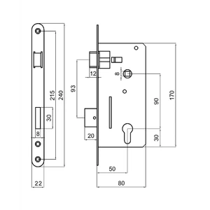 Zámek vložkový, zápust 80mm, rozteč 90mm