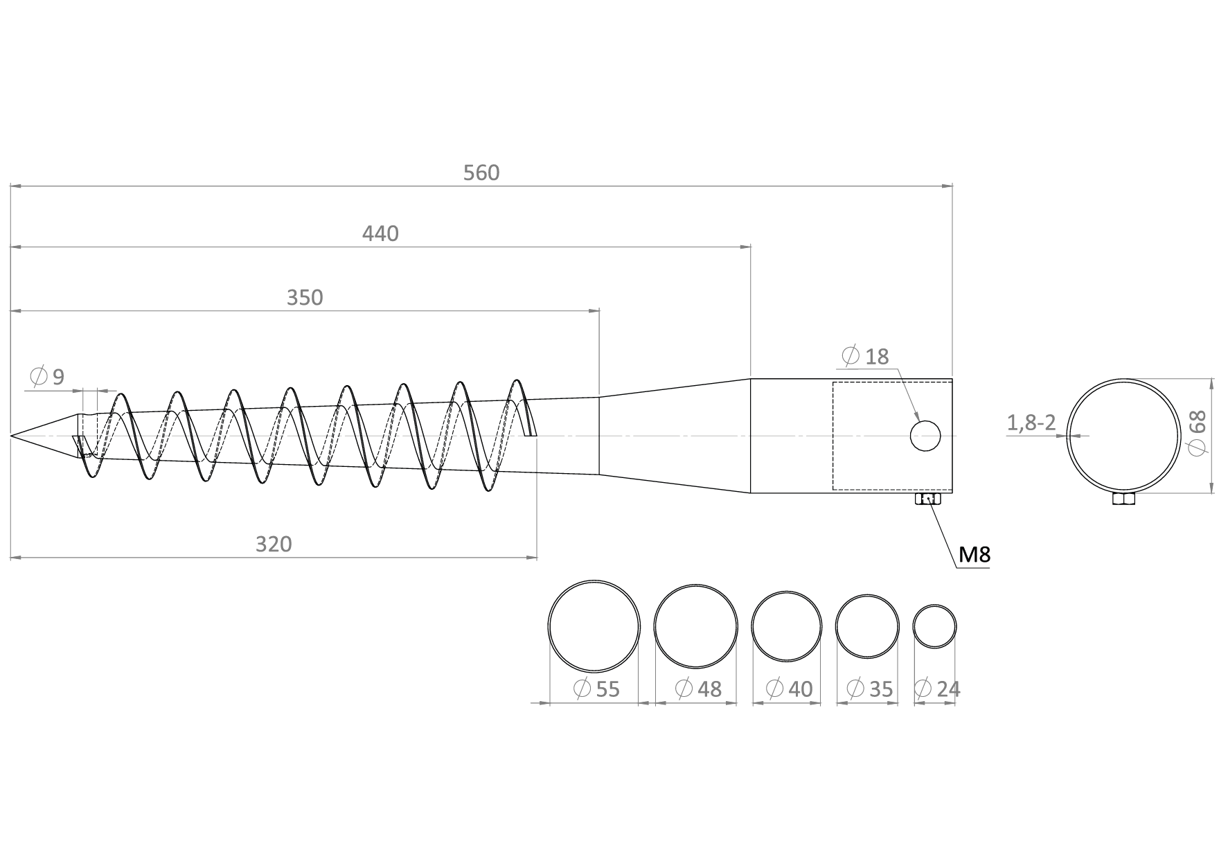 Zemní vrut s vymezeními ø 26 - 55 mm, žárový zinek